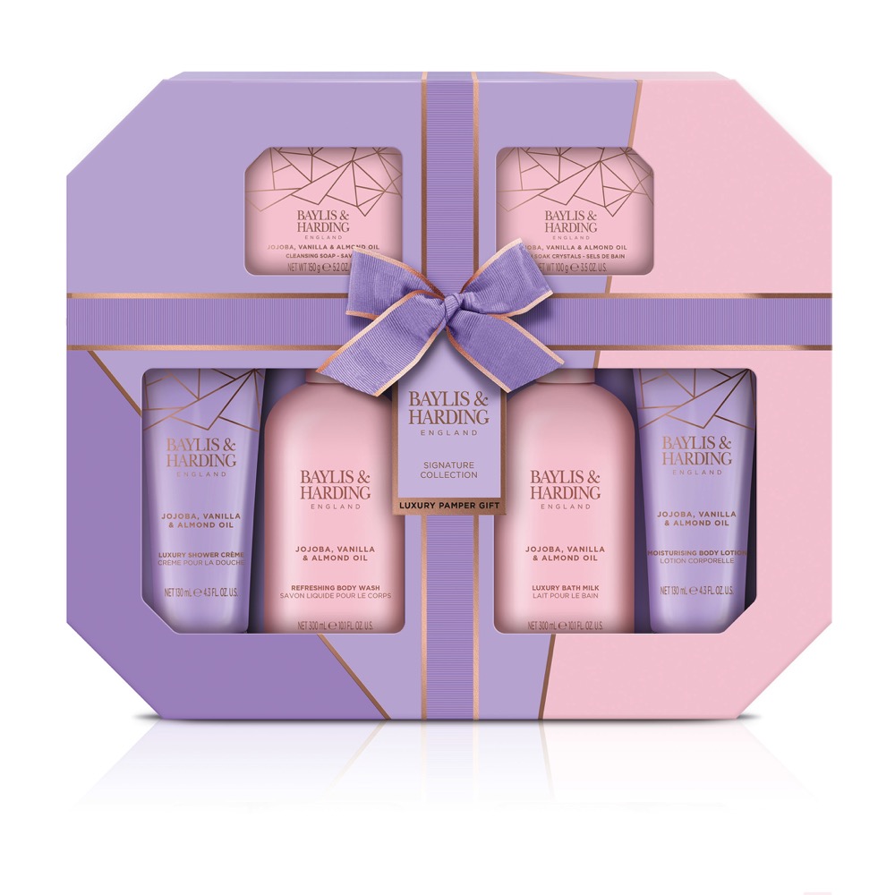 An impressive gift box containing luxurious 300ml body wash, 300ml bath milk, 150g soap, 130ml shower crème, 130ml body lotion and 100g bath soak crystals.