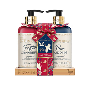 A delightful wooden rack displaying a 300ml hand wash and a 300ml hand & body lotion.